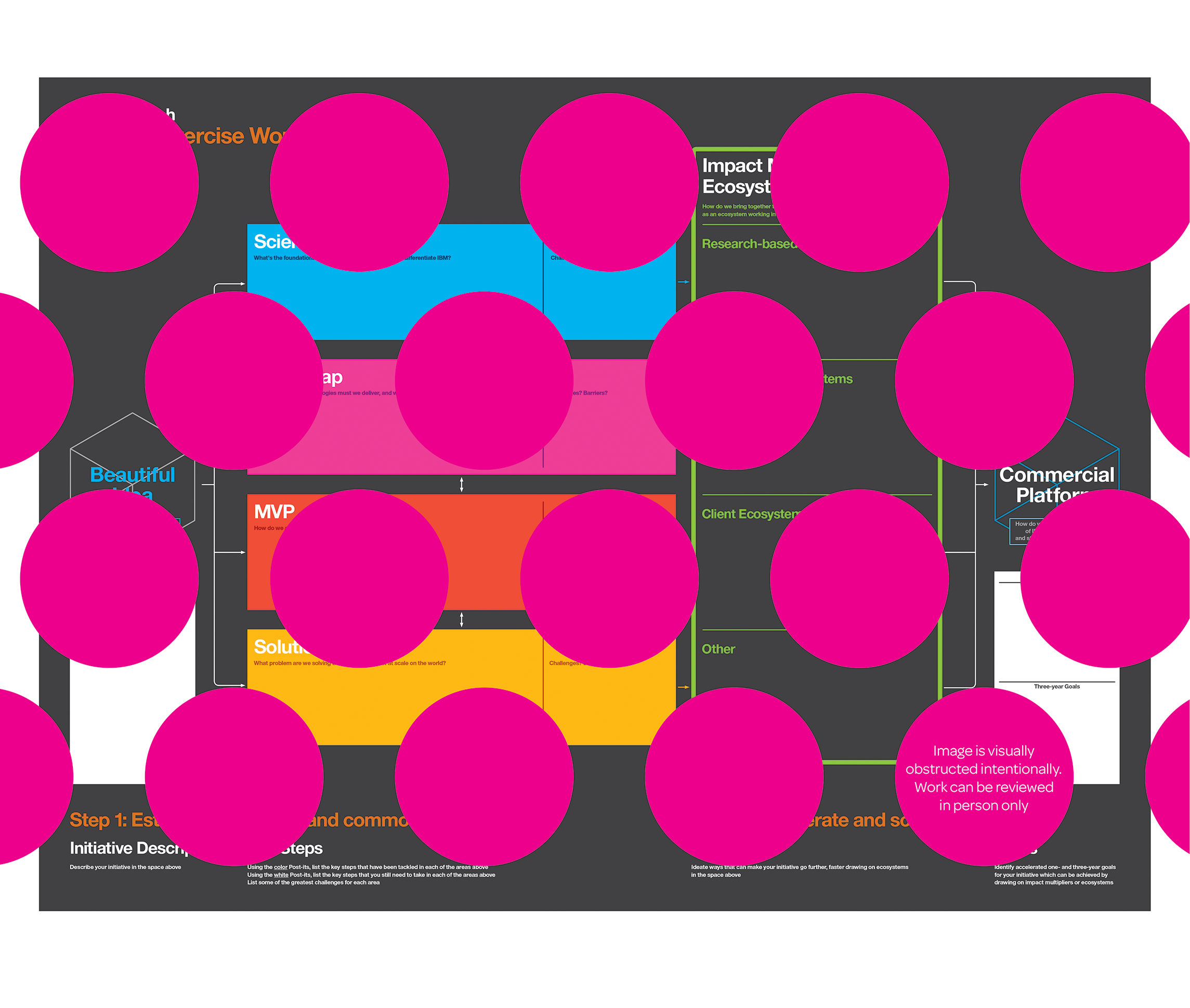 As a warm-up exercise, giant colorful Eames-inspired cards were used to share each attendee's “Beautiful Idea”. The two groups slowly became one in the form of a sculpture as a way for them to build this new enterprise together. Satisfying a curiosity about their peer motivations, the group saw themselves as kindred spirits— likeminded people with a collective goal to create impact using their minds.