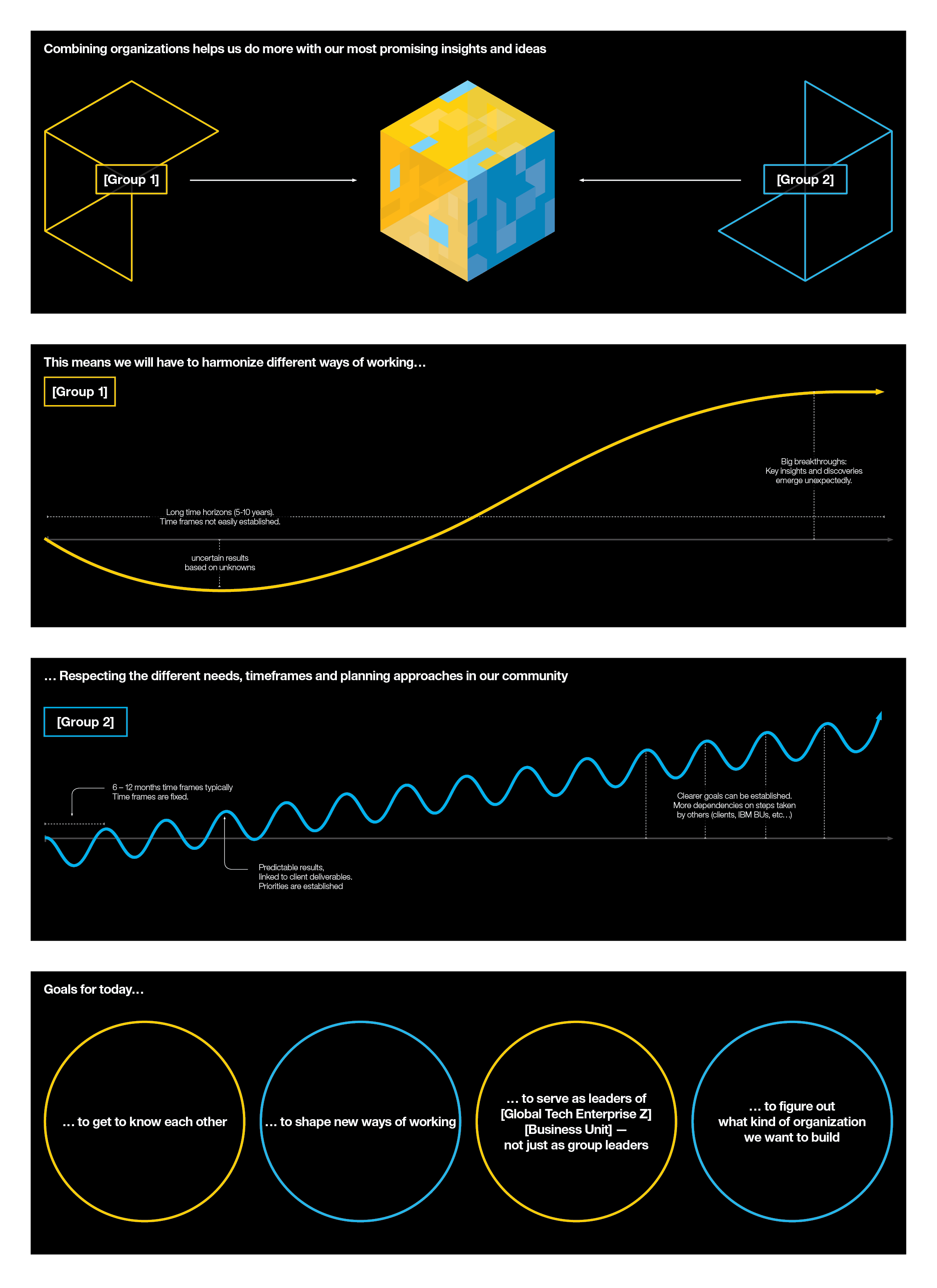To understand the working process between the two groups, teams worked through a physical model of the process (think, visual roadmap) using four pre-selected in-progress initiatives within the [Business Unit]. Success was achieved as the groups uncovered common issues, struggles, and potential solutions for maximum scalability of their respective initiatives.
